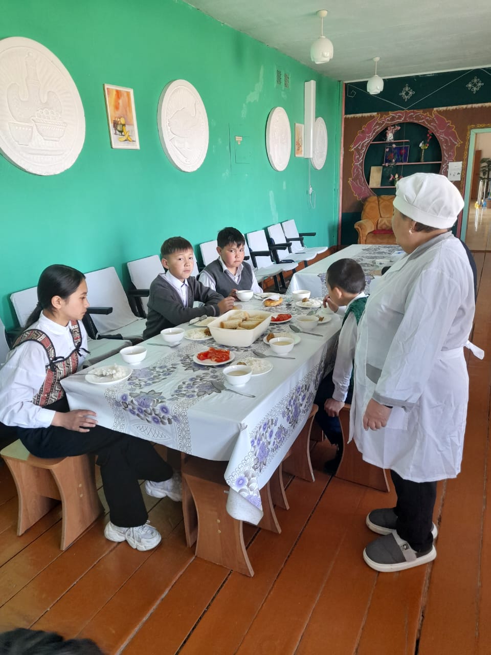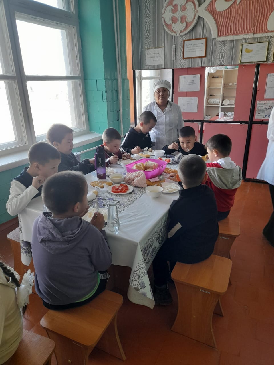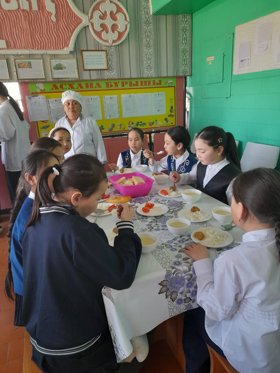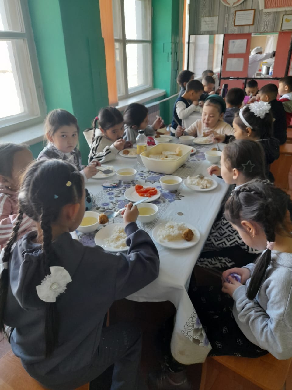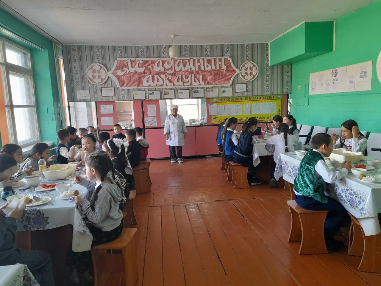 «Құйған орта мектебі» КММ мектеп асханасында күнделікті екі уақыт тегін ыстық тамақ ішетін оқушылар. Аспазшы Фарида Муханова.